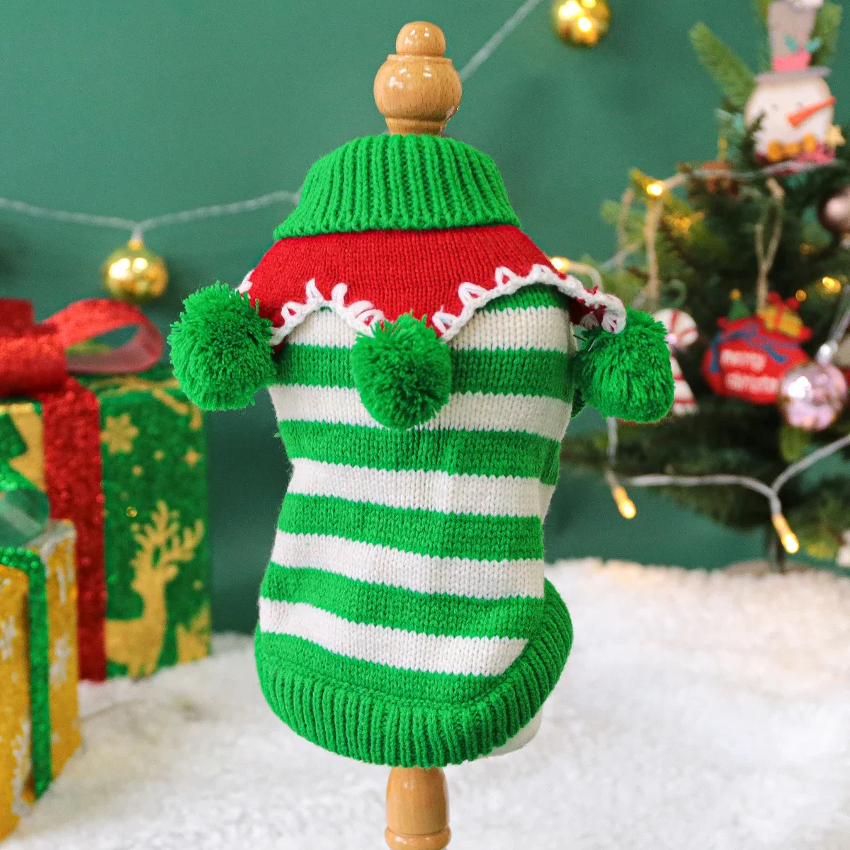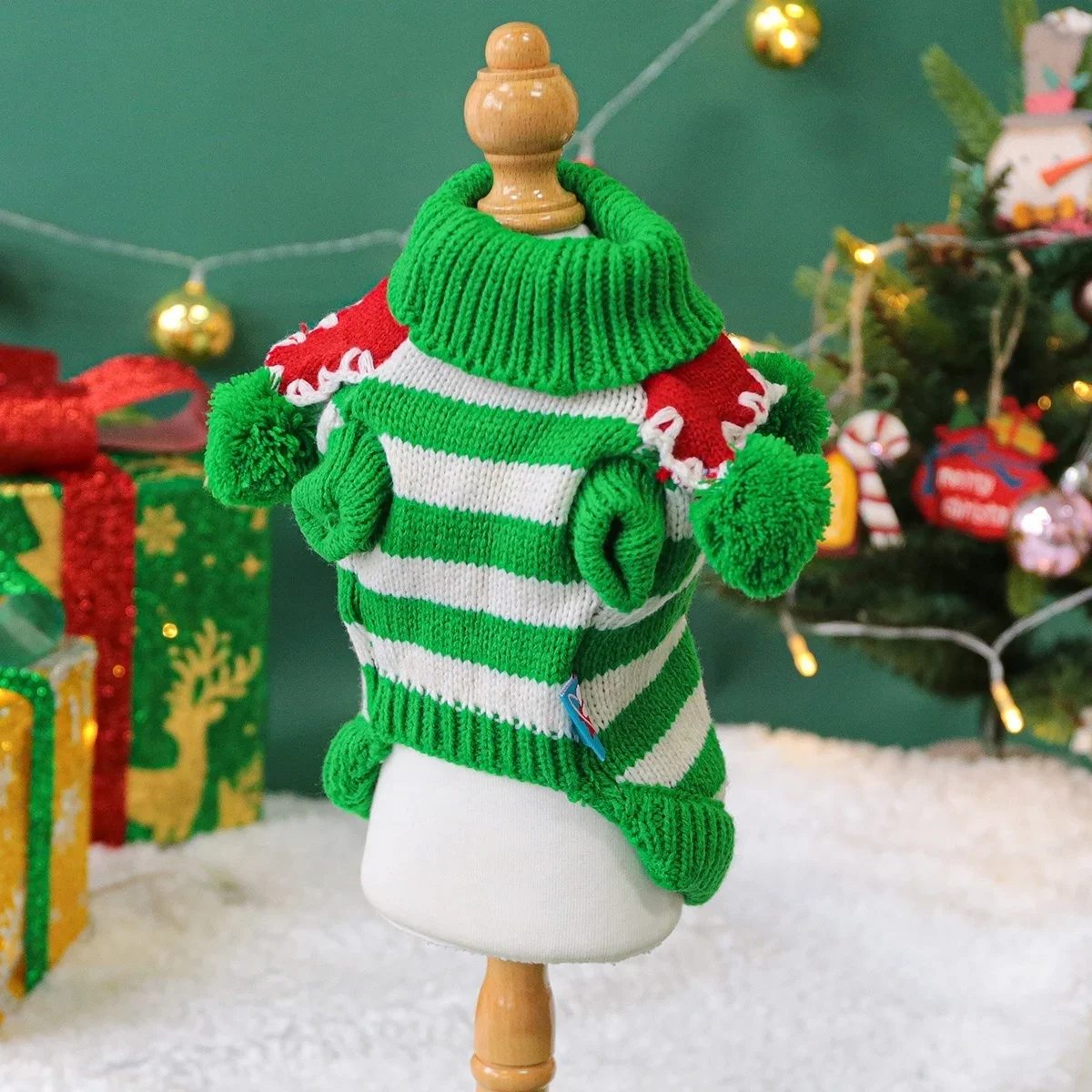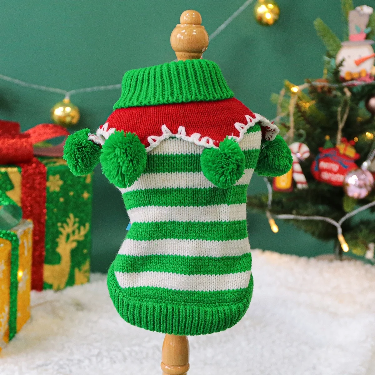 Keep your cat or dog cozy this autumn and winter with this universal green and white striped sweater. Made from soft, warm knitted fabric, it provides comfort while keeping your pet stylish for the holiday season. The stretchy design ensures a snug but flexible fit, allowing your furry friend to move freely. Lightweight yet warm, it’s perfect for indoor lounging or outdoor walks in chilly weather.